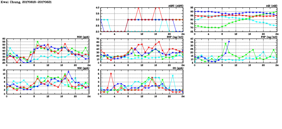 | Air Quality Data Time Series in Kwai Chung (2017/06/21) | ( Line colors: Day -3 Day -2 Day -1 Current day ) | 2D Map Current AQHI |