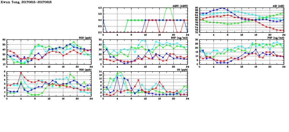 | Air Quality Data Time Series in Kwun Tong (2017/06/18) | ( Line colors: Day -3 Day -2 Day -1 Current day ) | 2D Map Current AQHI |