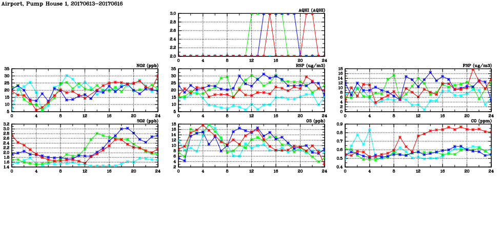 | Air Quality Data Time Series in Airport, Pump House 1 (2017/06/16) | ( Line colors: Day -3 Day -2 Day -1 Current day ) | 2D Map Current AQHI |