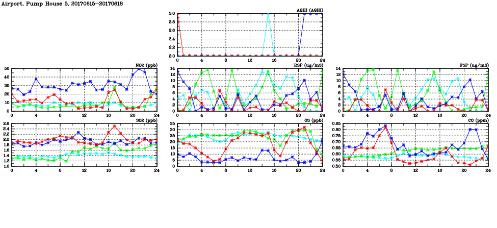 | Air Quality Data Time Series in Airport, Pump House 5 (2017/06/18) | ( Line colors: Day -3 Day -2 Day -1 Current day ) | 2D Map Current AQHI |