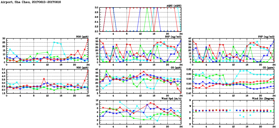 | Air Quality Data Time Series in Airport, Sha Chau (2017/06/16) | ( Line colors: Day -3 Day -2 Day -1 Current day ) | 2D Map Current AQHI |