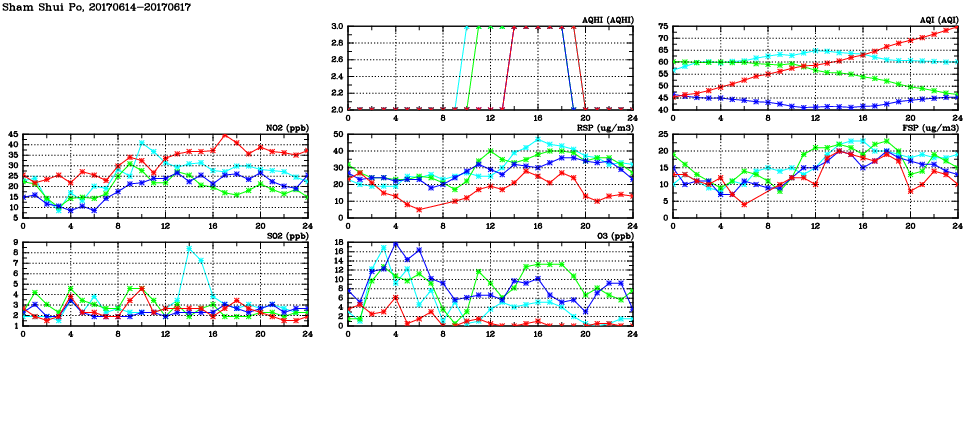 | Air Quality Data Time Series in Sham Shui Po (2017/06/17) | ( Line colors: Day -3 Day -2 Day -1 Current day ) | 2D Map Current AQHI |