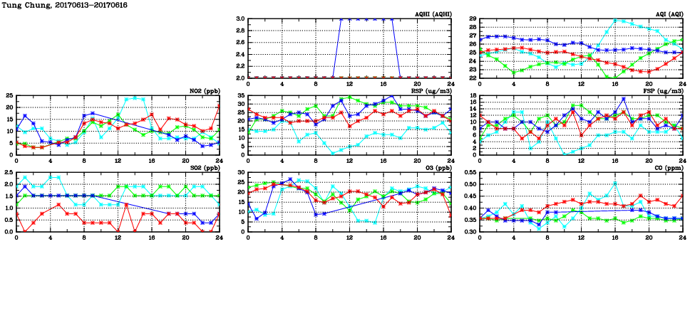 | Air Quality Data Time Series in Tung Chung (2017/06/16) | ( Line colors: Day -3 Day -2 Day -1 Current day ) | 2D Map Current AQHI |