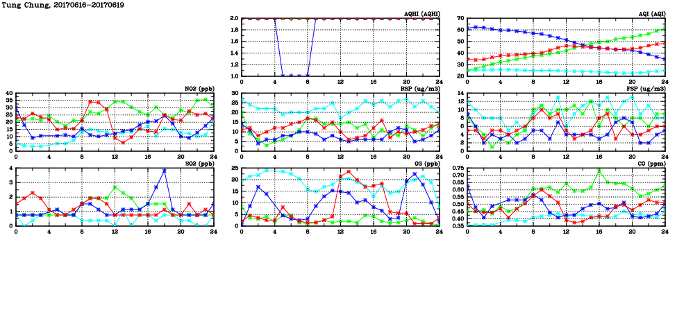 | Air Quality Data Time Series in Tung Chung (2017/06/19) | ( Line colors: Day -3 Day -2 Day -1 Current day ) | 2D Map Current AQHI |