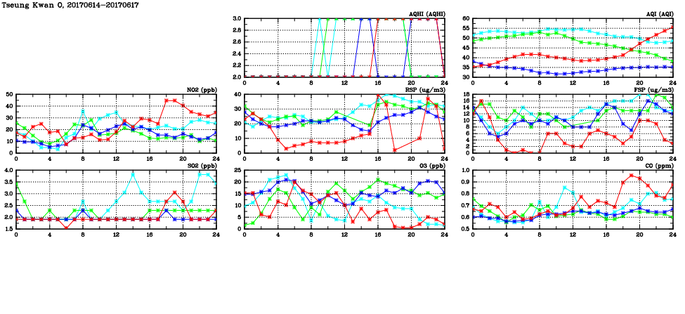 | Air Quality Data Time Series in Tseung Kwan O (2017/06/17) | ( Line colors: Day -3 Day -2 Day -1 Current day ) | 2D Map Current AQHI |
