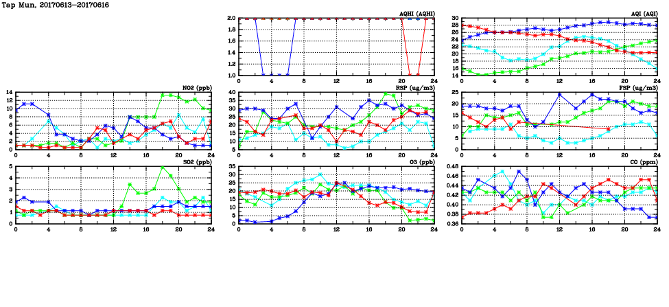 | Air Quality Data Time Series in Tap Mun (2017/06/16) | ( Line colors: Day -3 Day -2 Day -1 Current day ) | 2D Map Current AQHI |