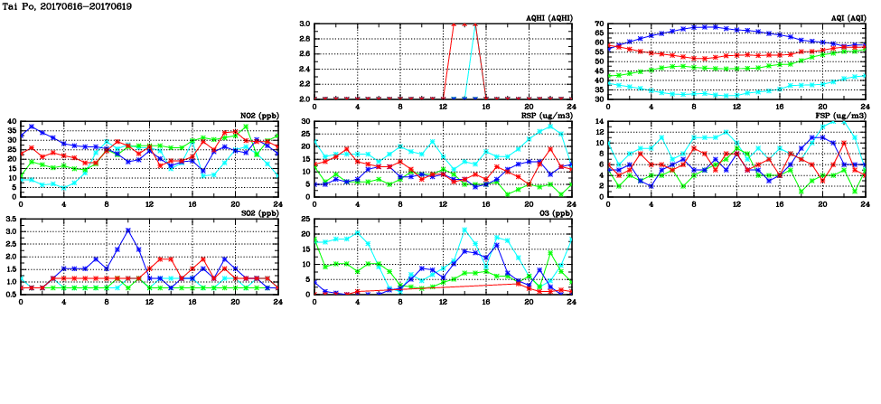 | Air Quality Data Time Series in Tai Po (2017/06/19) | ( Line colors: Day -3 Day -2 Day -1 Current day ) | 2D Map Current AQHI |