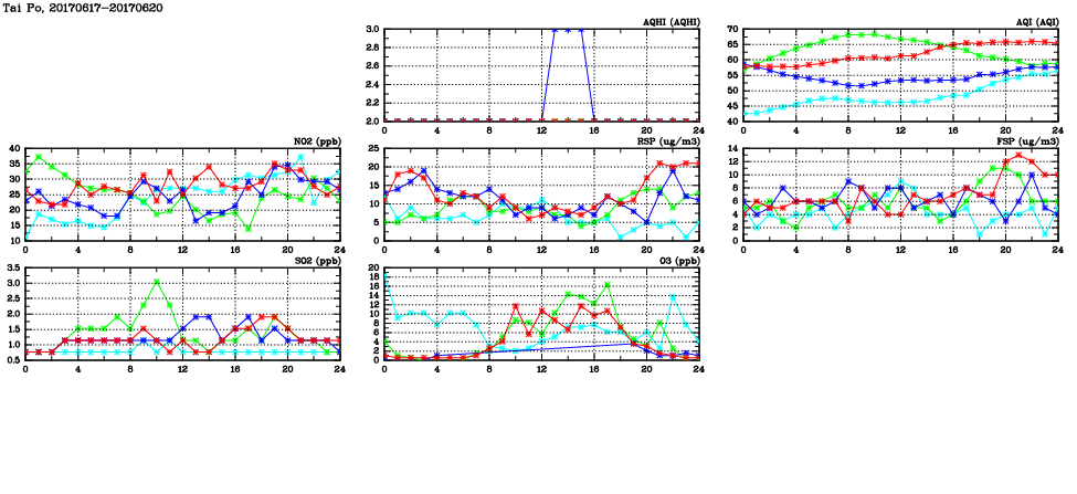 | Air Quality Data Time Series in Tai Po (2017/06/20) | ( Line colors: Day -3 Day -2 Day -1 Current day ) | 2D Map Current AQHI |