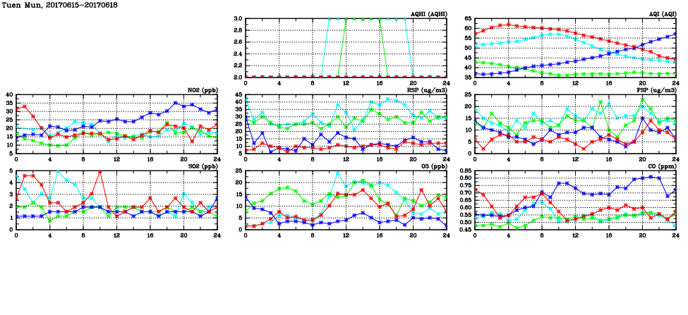 | Air Quality Data Time Series in Tuen Mun (2017/06/18) | ( Line colors: Day -3 Day -2 Day -1 Current day ) | 2D Map Current AQHI |