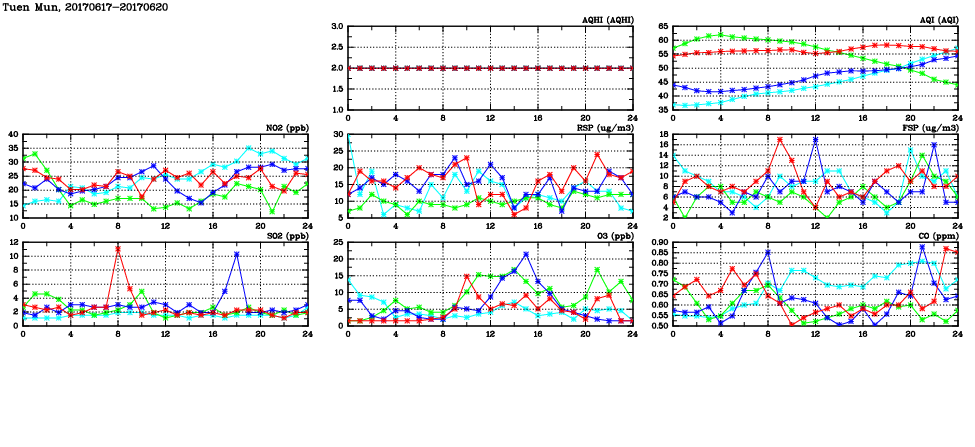 | Air Quality Data Time Series in Tuen Mun (2017/06/20) | ( Line colors: Day -3 Day -2 Day -1 Current day ) | 2D Map Current AQHI |
