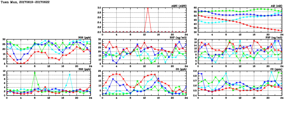 | Air Quality Data Time Series in Tuen Mun (2017/06/22) | ( Line colors: Day -3 Day -2 Day -1 Current day ) | 2D Map Current AQHI |