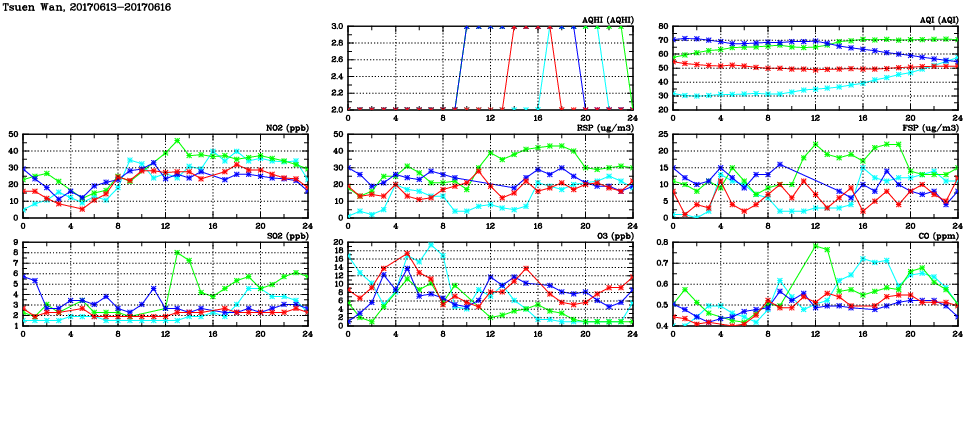 | Air Quality Data Time Series in Tsuen Wan (2017/06/16) | ( Line colors: Day -3 Day -2 Day -1 Current day ) | 2D Map Current AQHI |