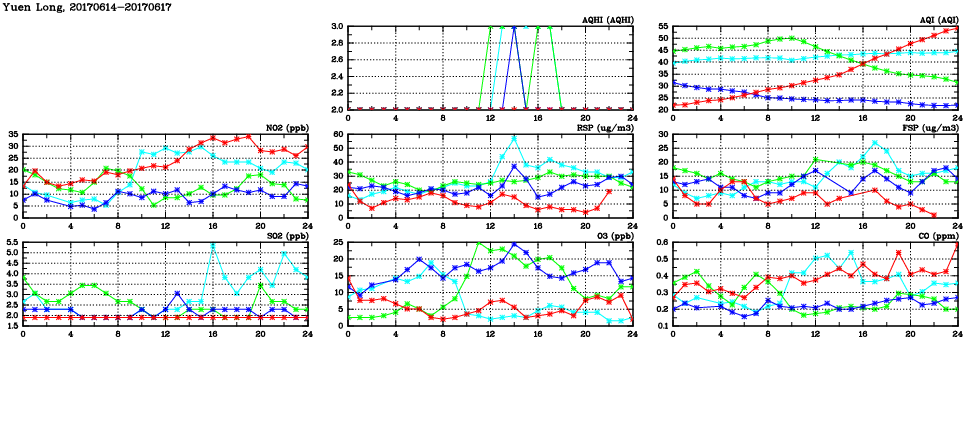 | Air Quality Data Time Series in Yuen Long (2017/06/17) | ( Line colors: Day -3 Day -2 Day -1 Current day ) | 2D Map Current AQHI |