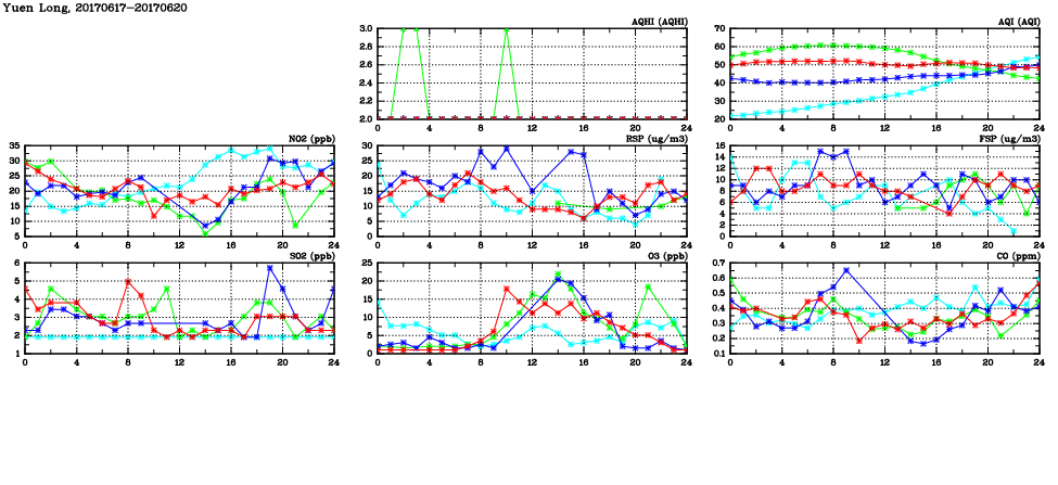 | Air Quality Data Time Series in Yuen Long (2017/06/20) | ( Line colors: Day -3 Day -2 Day -1 Current day ) | 2D Map Current AQHI |