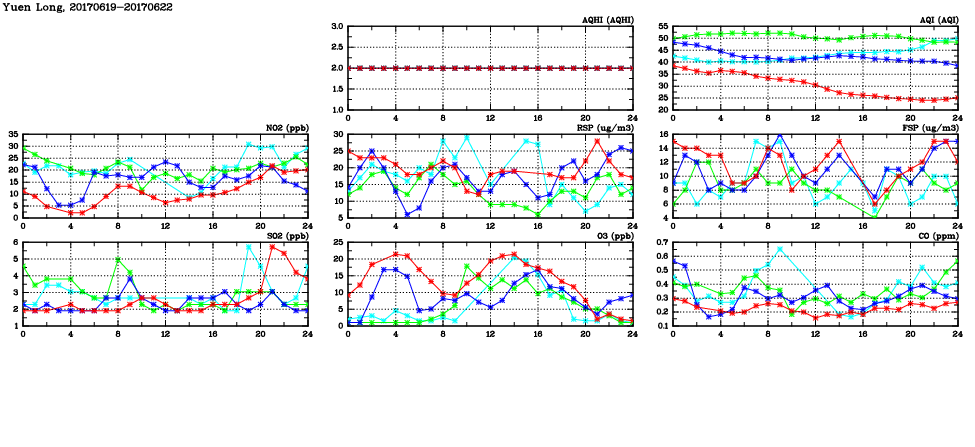 | Air Quality Data Time Series in Yuen Long (2017/06/22) | ( Line colors: Day -3 Day -2 Day -1 Current day ) | 2D Map Current AQHI |