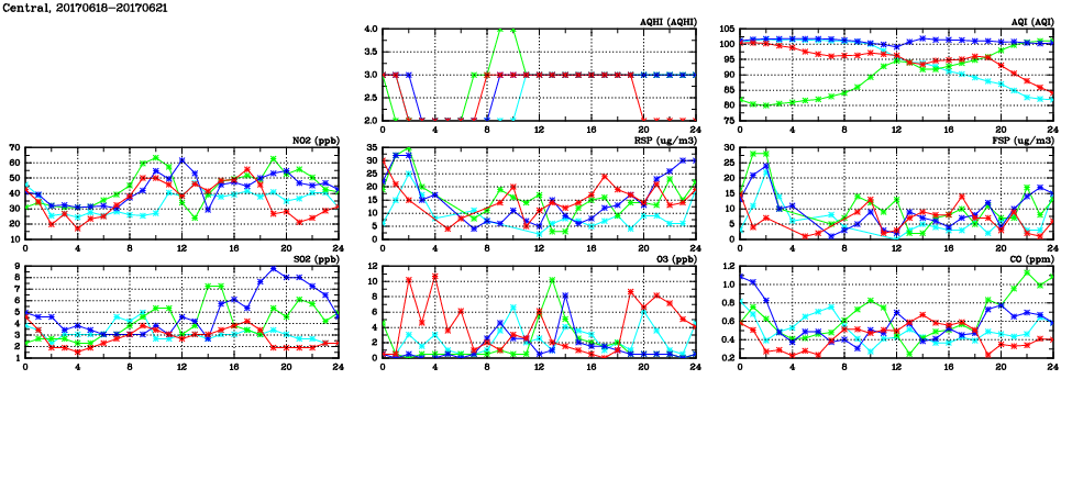 | Air Quality Data Time Series in Central (2017/06/21) | ( Line colors: Day -3 Day -2 Day -1 Current day ) | 2D Map Current AQHI |