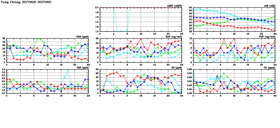 | Air Quality Data Time Series in Tung Chung (2017/06/21) | ( Line colors: Day -3 Day -2 Day -1 Current day ) | 2D Map Current AQHI |