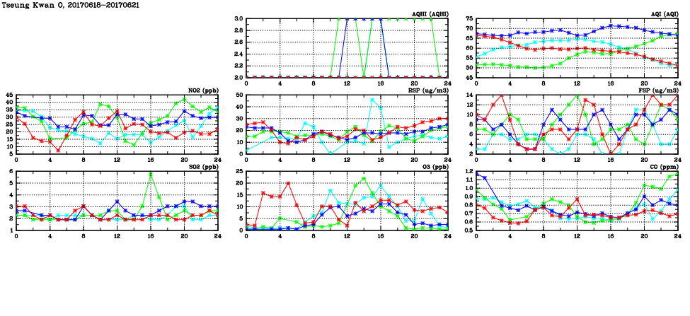 | Air Quality Data Time Series in Tseung Kwan O (2017/06/21) | ( Line colors: Day -3 Day -2 Day -1 Current day ) | 2D Map Current AQHI |