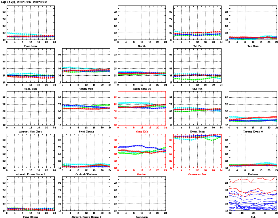 | Air Quality Data Time Series for AQI (2017/06/28) | ( Line colors: Day -3 Day -2 Day -1 Current day ) | 2D Map Current AQHI |