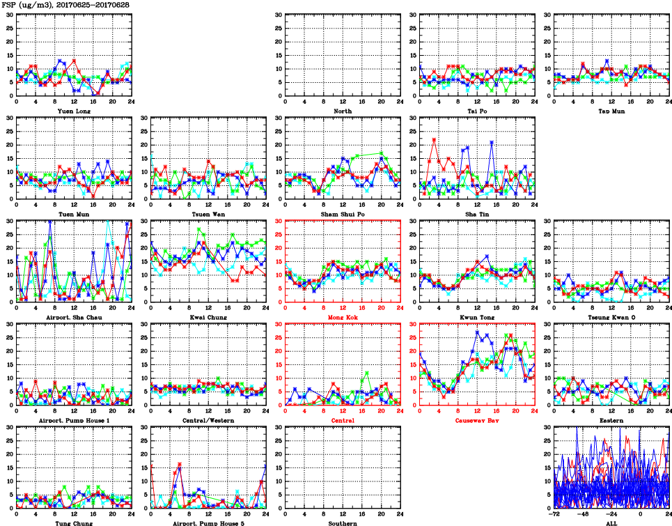| Air Quality Data Time Series for FSP (2017/06/28) | ( Line colors: Day -3 Day -2 Day -1 Current day ) | 2D Map Current AQHI |