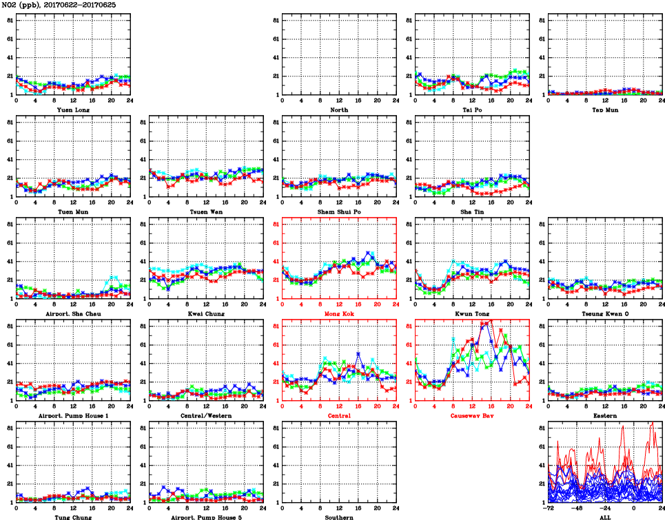 | Air Quality Data Time Series for NO2 (2017/06/25) | ( Line colors: Day -3 Day -2 Day -1 Current day ) | 2D Map Current AQHI |