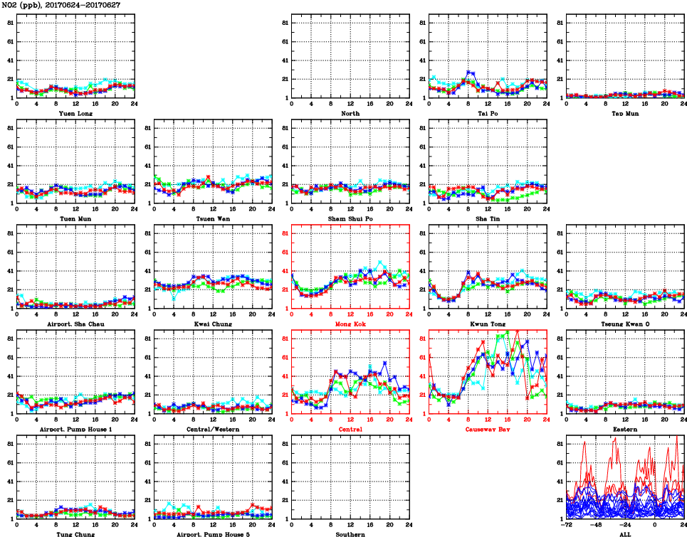 | Air Quality Data Time Series for NO2 (2017/06/27) | ( Line colors: Day -3 Day -2 Day -1 Current day ) | 2D Map Current AQHI |