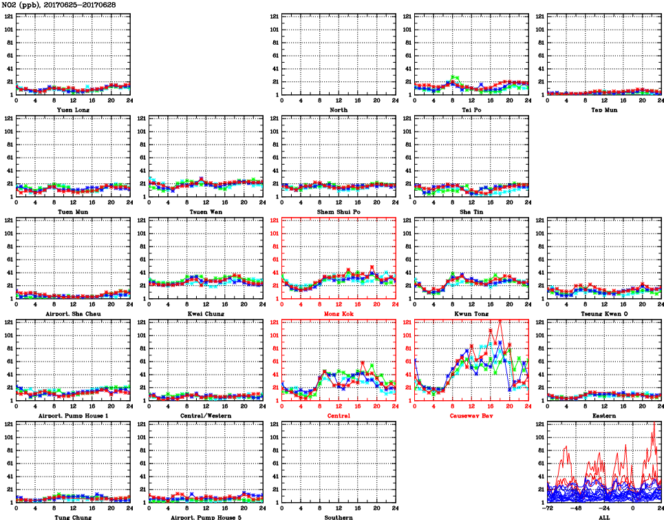 | Air Quality Data Time Series for NO2 (2017/06/28) | ( Line colors: Day -3 Day -2 Day -1 Current day ) | 2D Map Current AQHI |