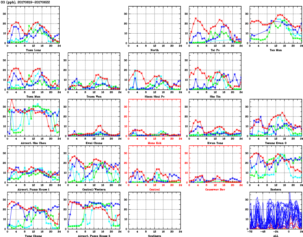| Air Quality Data Time Series for O3 (2017/06/22) | ( Line colors: Day -3 Day -2 Day -1 Current day ) | 2D Map Current AQHI |