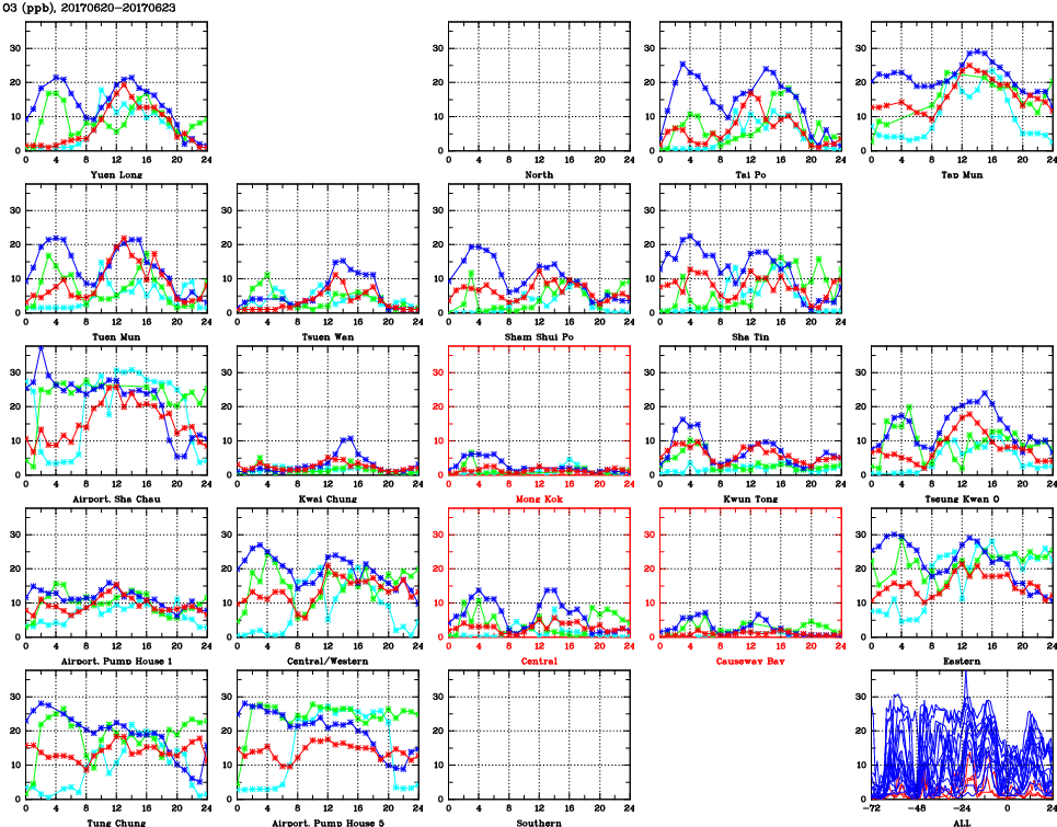 | Air Quality Data Time Series for O3 (2017/06/23) | ( Line colors: Day -3 Day -2 Day -1 Current day ) | 2D Map Current AQHI |