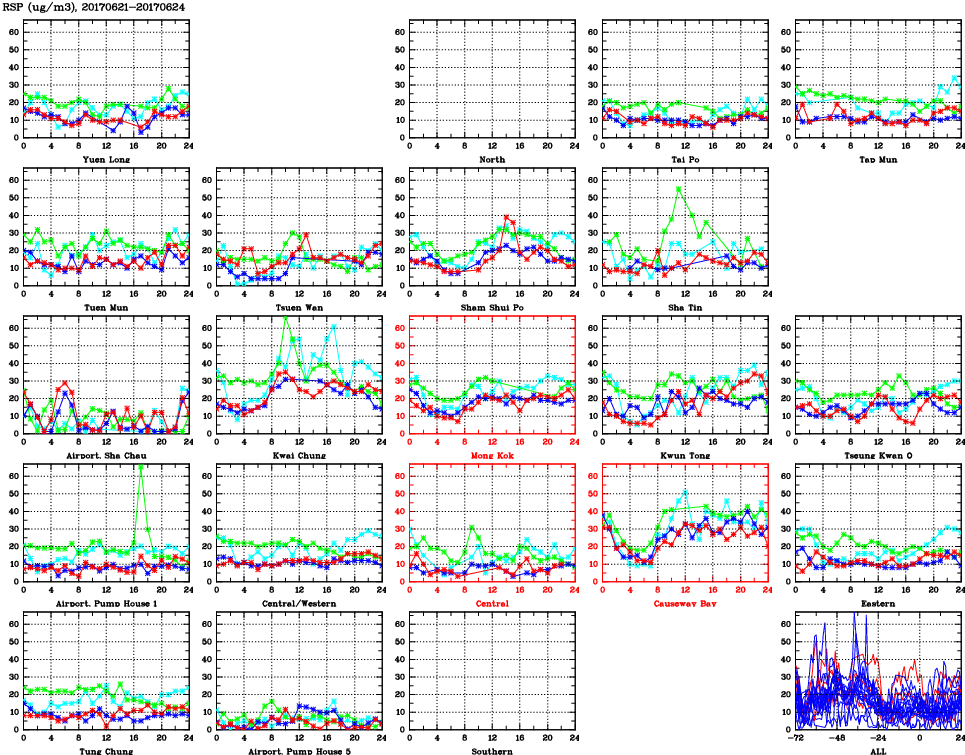 | Air Quality Data Time Series for RSP (2017/06/24) | ( Line colors: Day -3 Day -2 Day -1 Current day ) | 2D Map Current AQHI |