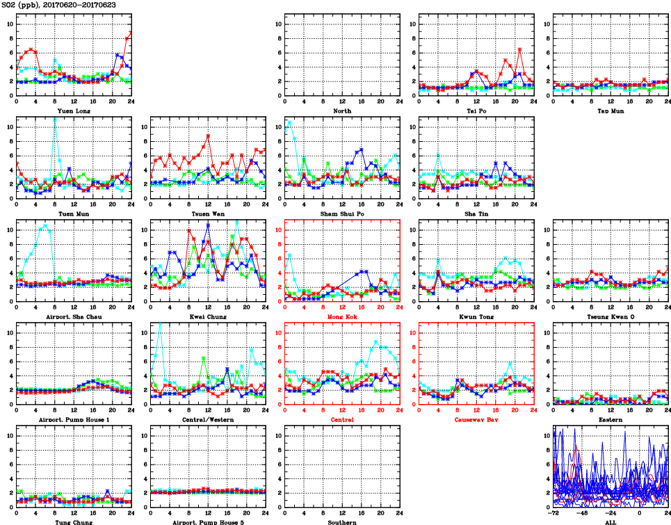 | Air Quality Data Time Series for SO2 (2017/06/23) | ( Line colors: Day -3 Day -2 Day -1 Current day ) | 2D Map Current AQHI |