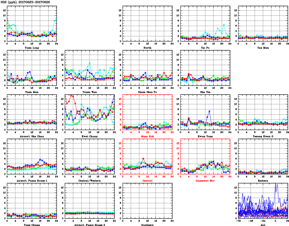 | Air Quality Data Time Series for SO2 (2017/06/26) | ( Line colors: Day -3 Day -2 Day -1 Current day ) | 2D Map Current AQHI |
