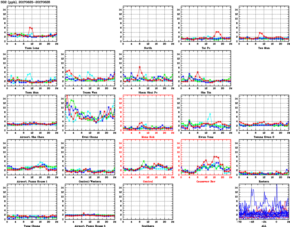 Air Quality Data Time Series for SO2 (2017/06/28) ( Line colors: Day -3 Day -2 Day -1 Current day ) 2D Map   Current AQHI