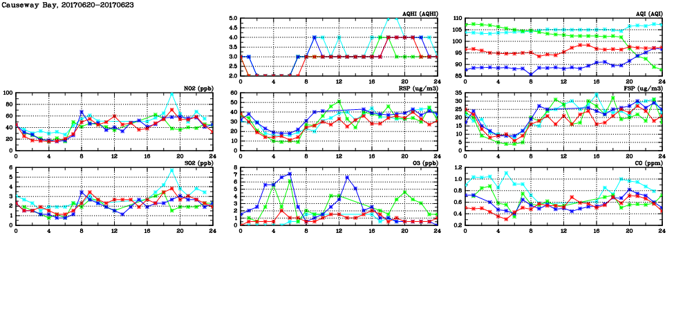| Air Quality Data Time Series in Causeway Bay (2017/06/23) | ( Line colors: Day -3 Day -2 Day -1 Current day ) | 2D Map Current AQHI |
