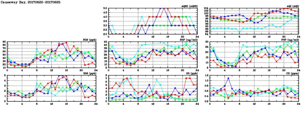 | Air Quality Data Time Series in Causeway Bay (2017/06/25) | ( Line colors: Day -3 Day -2 Day -1 Current day ) | 2D Map Current AQHI |