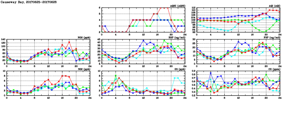| Air Quality Data Time Series in Causeway Bay (2017/06/28) | ( Line colors: Day -3 Day -2 Day -1 Current day ) | 2D Map Current AQHI |