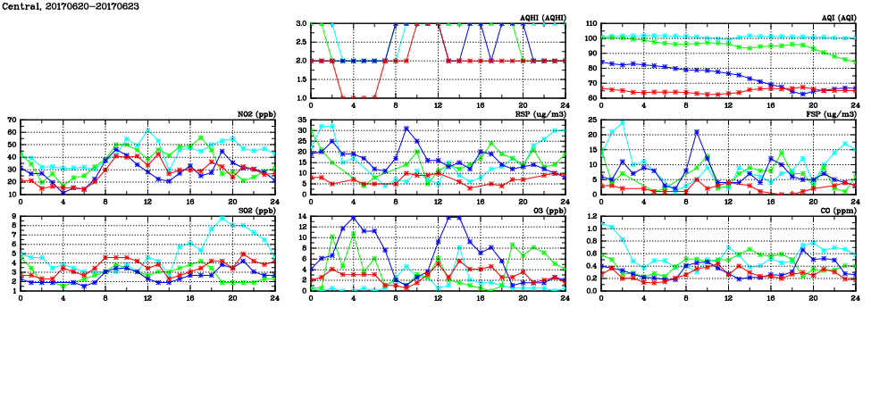 | Air Quality Data Time Series in Central (2017/06/23) | ( Line colors: Day -3 Day -2 Day -1 Current day ) | 2D Map Current AQHI |
