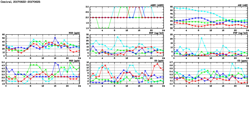 | Air Quality Data Time Series in Central (2017/06/25) | ( Line colors: Day -3 Day -2 Day -1 Current day ) | 2D Map Current AQHI |