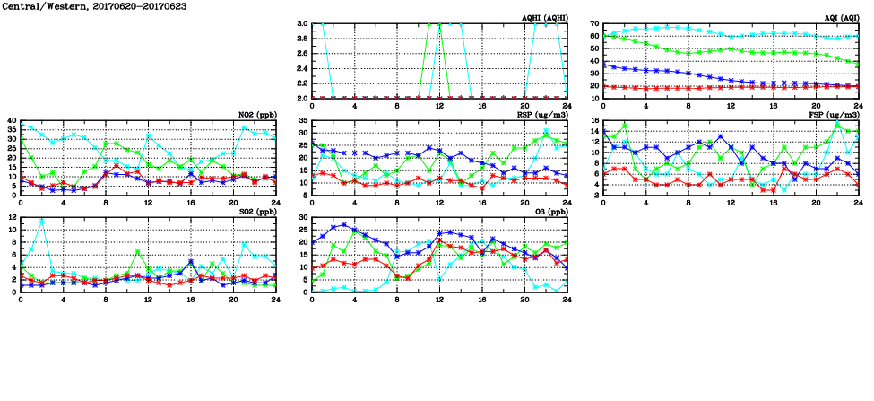 | Air Quality Data Time Series in Central/Western (2017/06/23) | ( Line colors: Day -3 Day -2 Day -1 Current day ) | 2D Map Current AQHI |