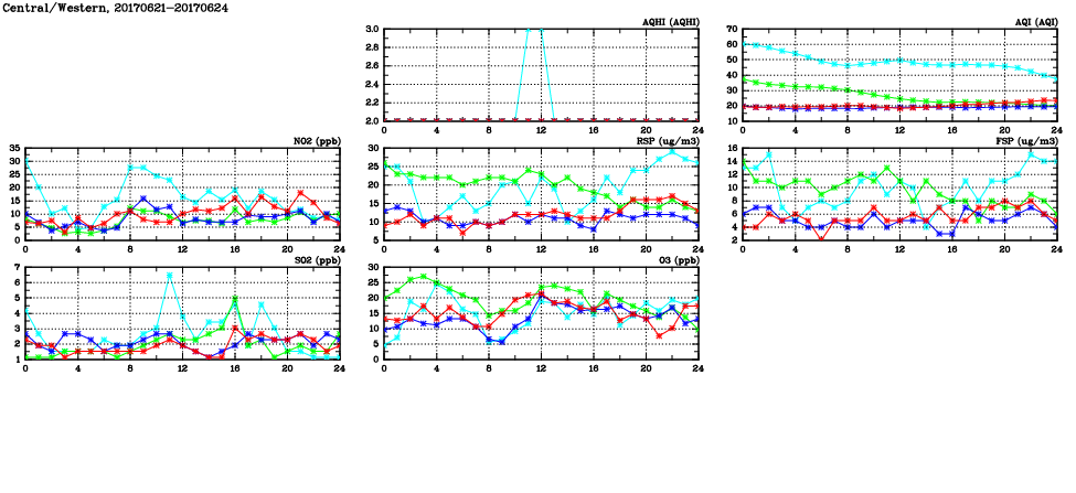 | Air Quality Data Time Series in Central/Western (2017/06/24) | ( Line colors: Day -3 Day -2 Day -1 Current day ) | 2D Map Current AQHI |