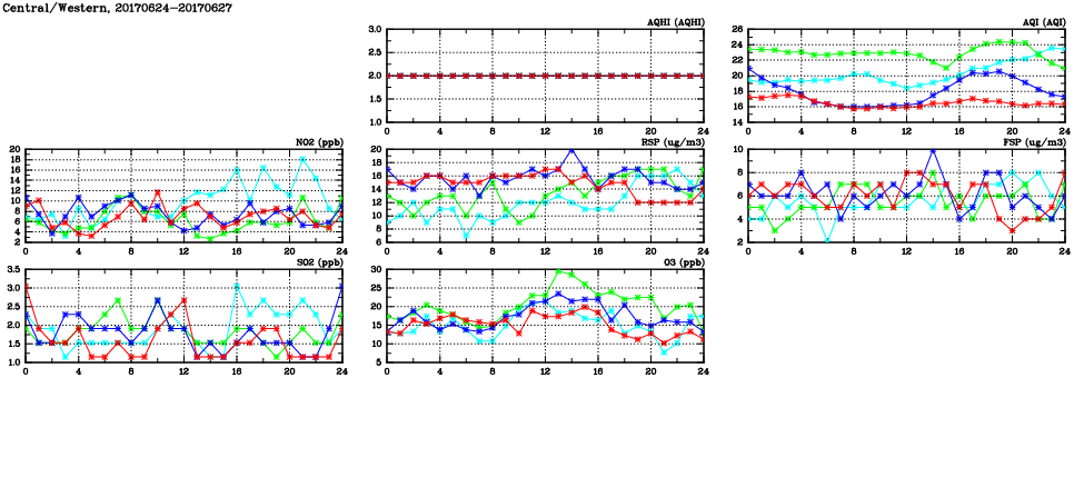 | Air Quality Data Time Series in Central/Western (2017/06/27) | ( Line colors: Day -3 Day -2 Day -1 Current day ) | 2D Map Current AQHI |