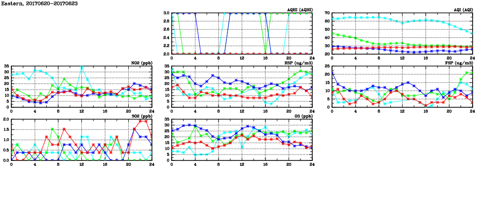 | Air Quality Data Time Series in Eastern (2017/06/23) | ( Line colors: Day -3 Day -2 Day -1 Current day ) | 2D Map Current AQHI |