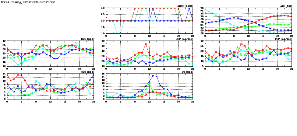 | Air Quality Data Time Series in Kwai Chung (2017/06/26) | ( Line colors: Day -3 Day -2 Day -1 Current day ) | 2D Map Current AQHI |