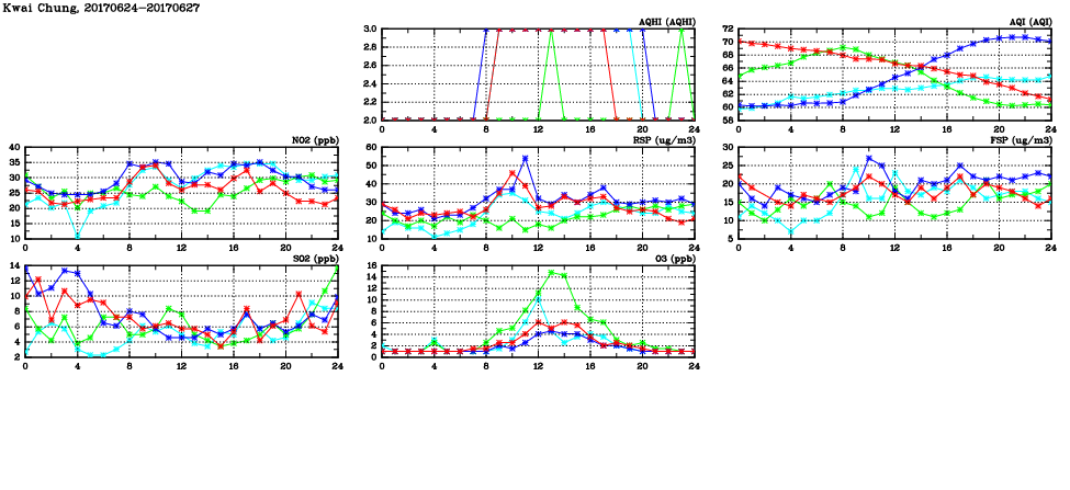 | Air Quality Data Time Series in Kwai Chung (2017/06/27) | ( Line colors: Day -3 Day -2 Day -1 Current day ) | 2D Map Current AQHI |