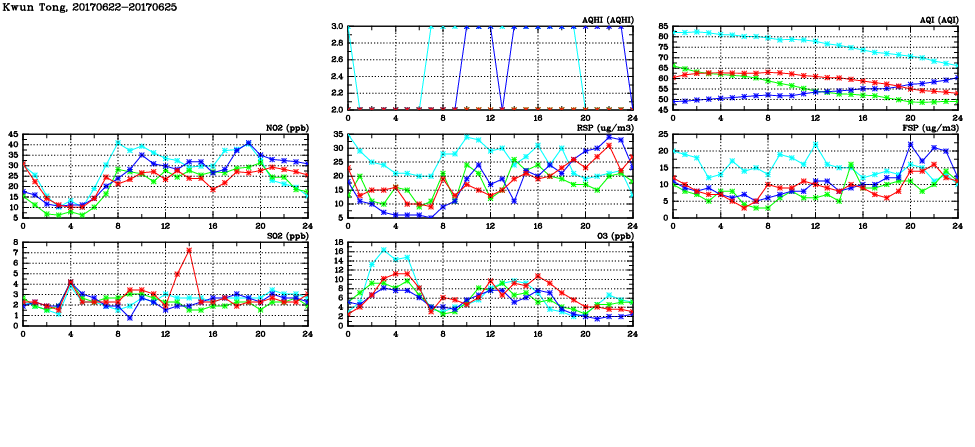 | Air Quality Data Time Series in Kwun Tong (2017/06/25) | ( Line colors: Day -3 Day -2 Day -1 Current day ) | 2D Map Current AQHI |