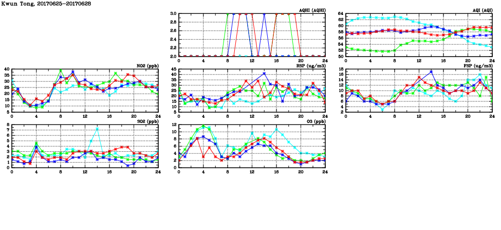 | Air Quality Data Time Series in Kwun Tong (2017/06/28) | ( Line colors: Day -3 Day -2 Day -1 Current day ) | 2D Map Current AQHI |