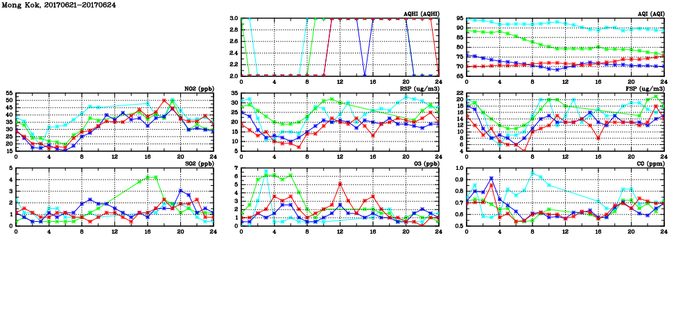 | Air Quality Data Time Series in Mong Kok (2017/06/24) | ( Line colors: Day -3 Day -2 Day -1 Current day ) | 2D Map Current AQHI |