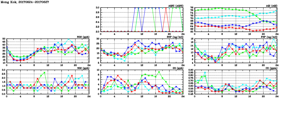 | Air Quality Data Time Series in Mong Kok (2017/06/27) | ( Line colors: Day -3 Day -2 Day -1 Current day ) | 2D Map Current AQHI |