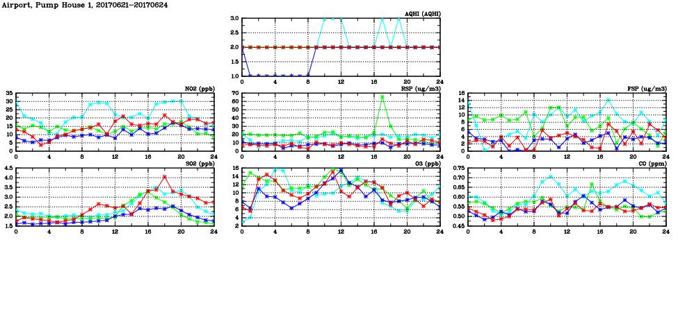 | Air Quality Data Time Series in Airport, Pump House 1 (2017/06/24) | ( Line colors: Day -3 Day -2 Day -1 Current day ) | 2D Map Current AQHI |