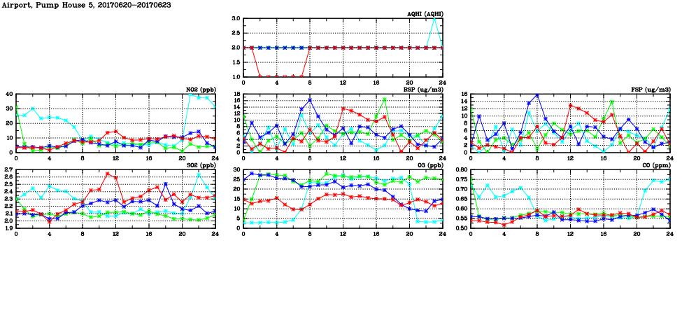 | Air Quality Data Time Series in Airport, Pump House 5 (2017/06/23) | ( Line colors: Day -3 Day -2 Day -1 Current day ) | 2D Map Current AQHI |